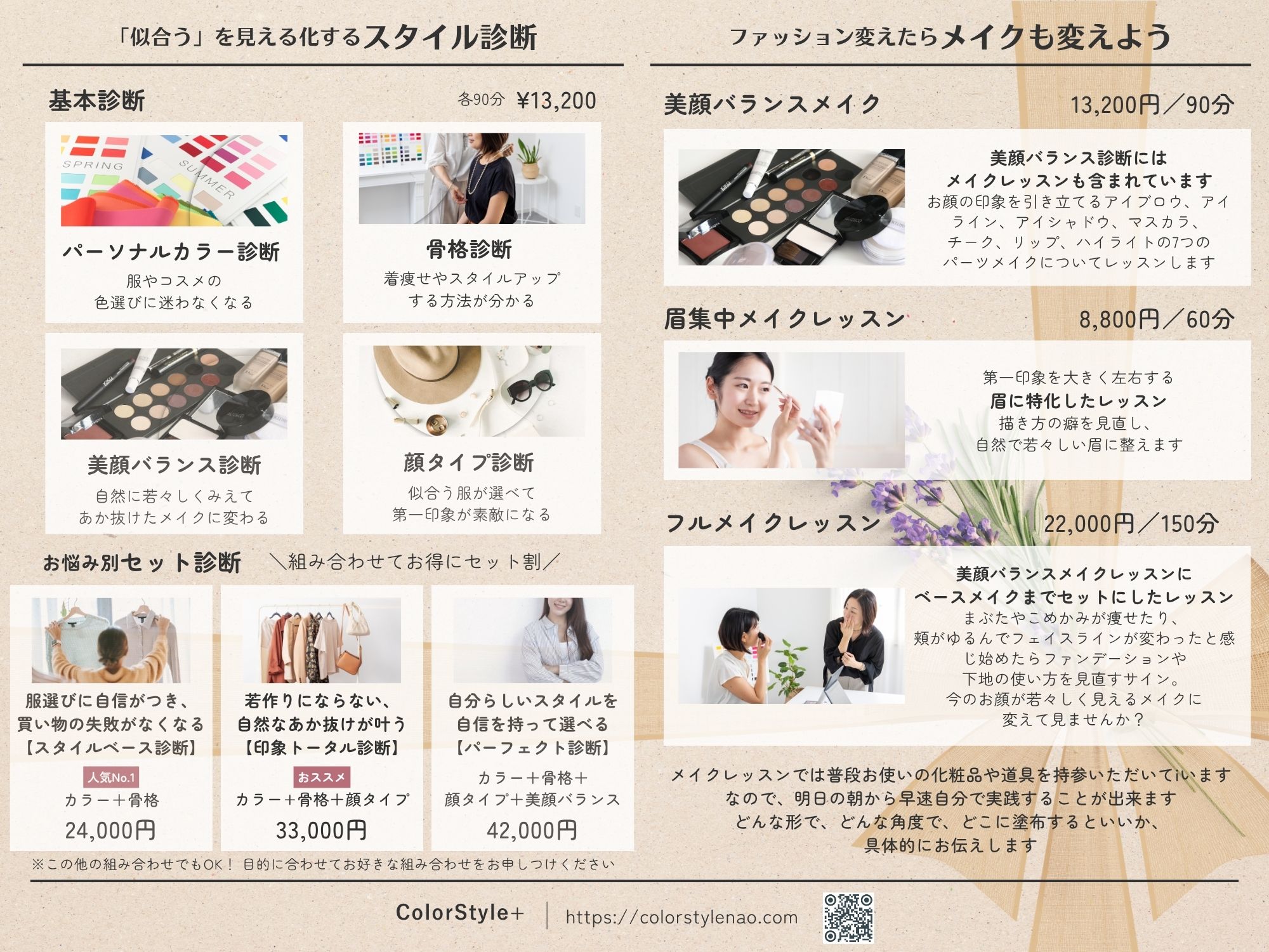 パーソナルカラー・骨格・顔タイプの3つを同日診断できるセットです。